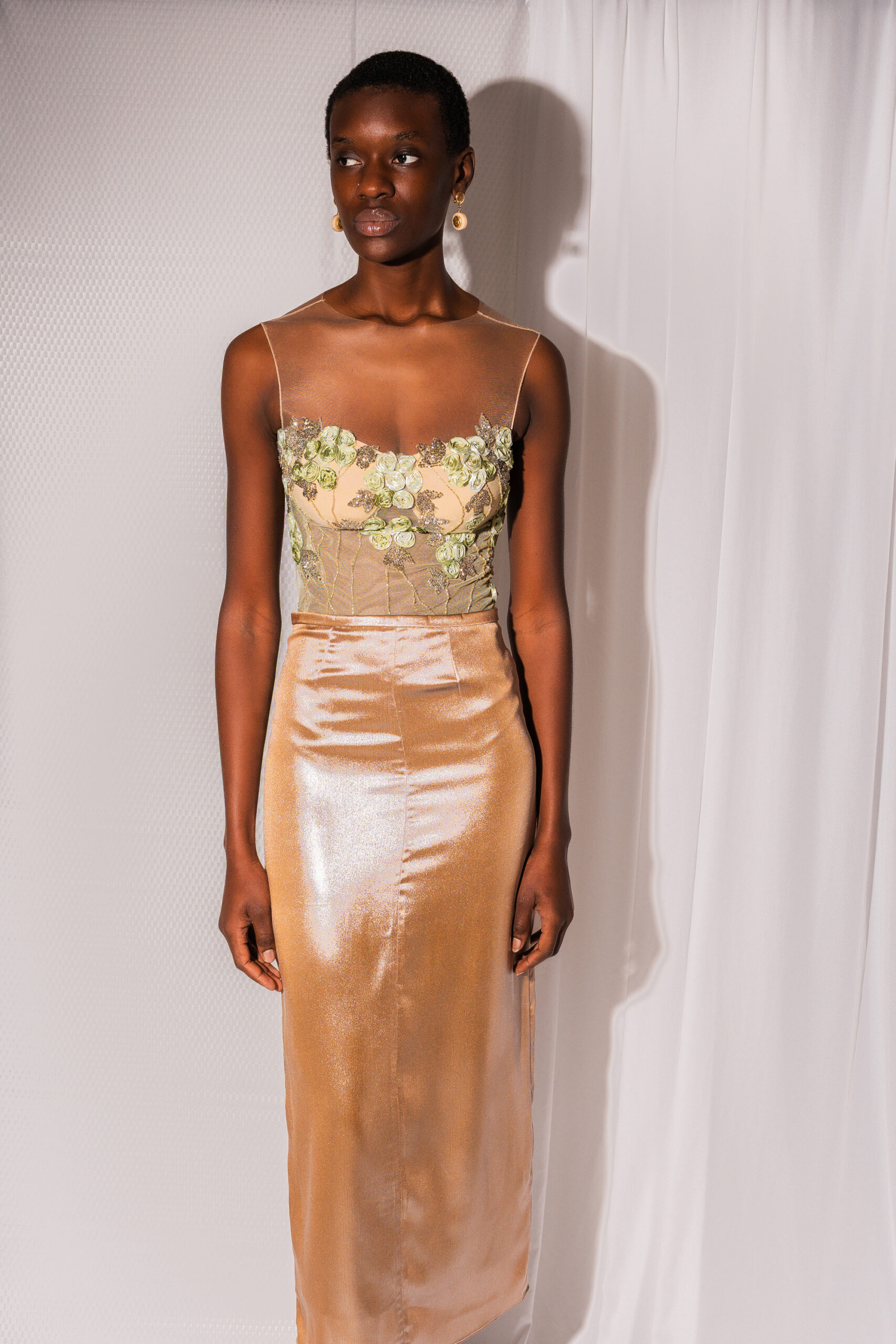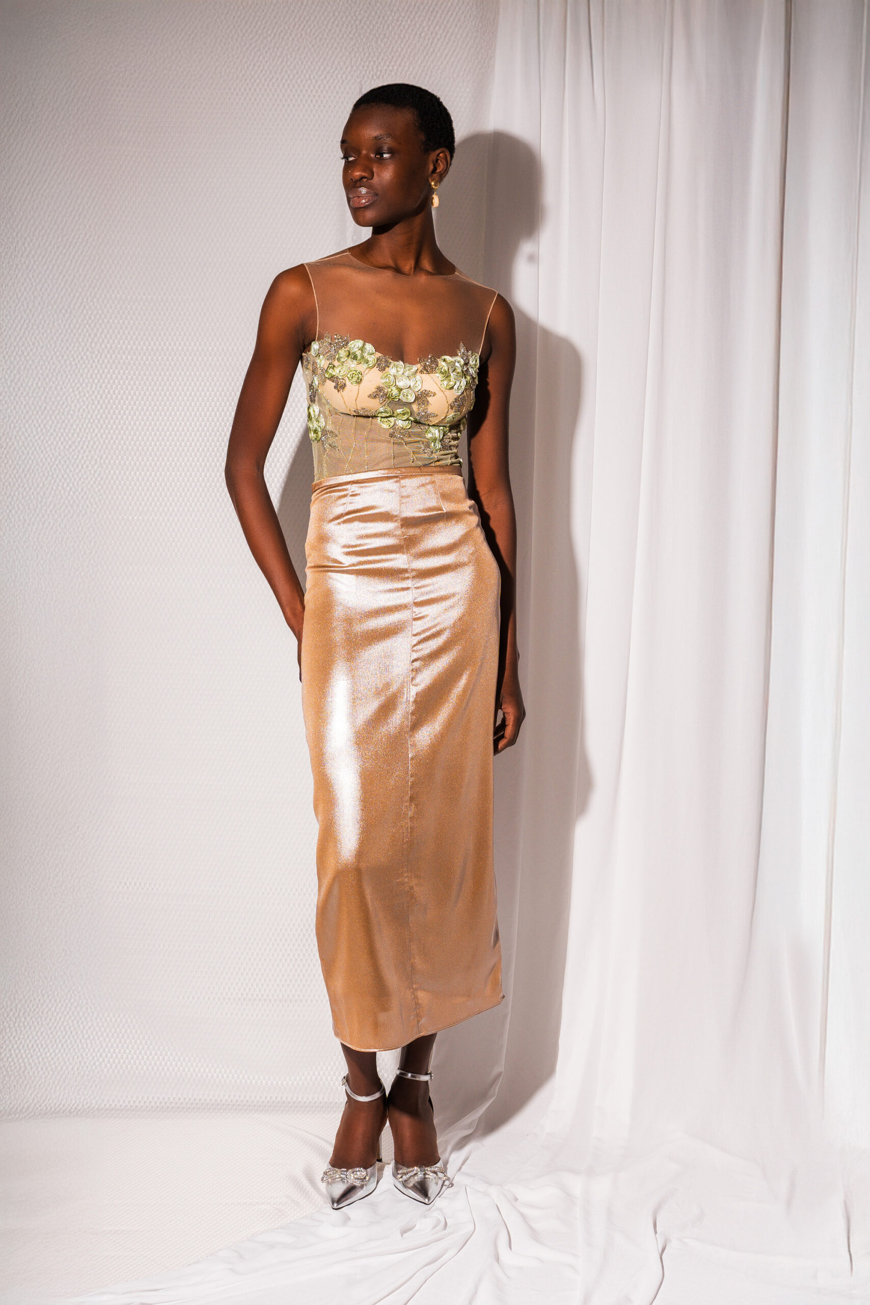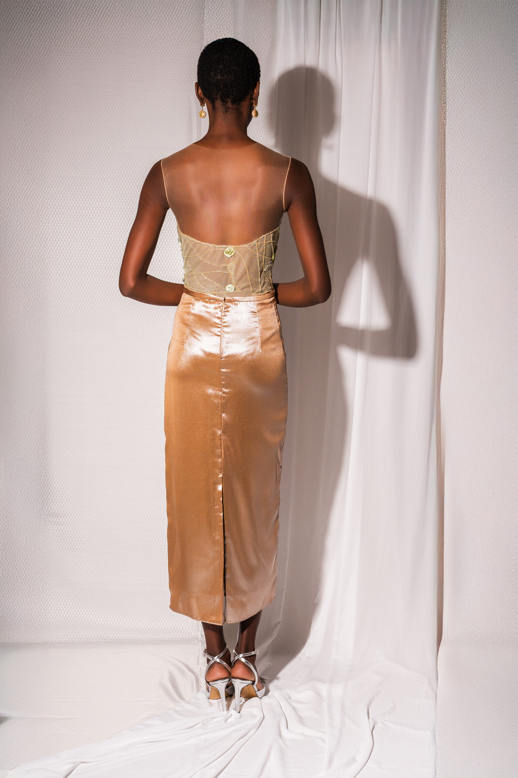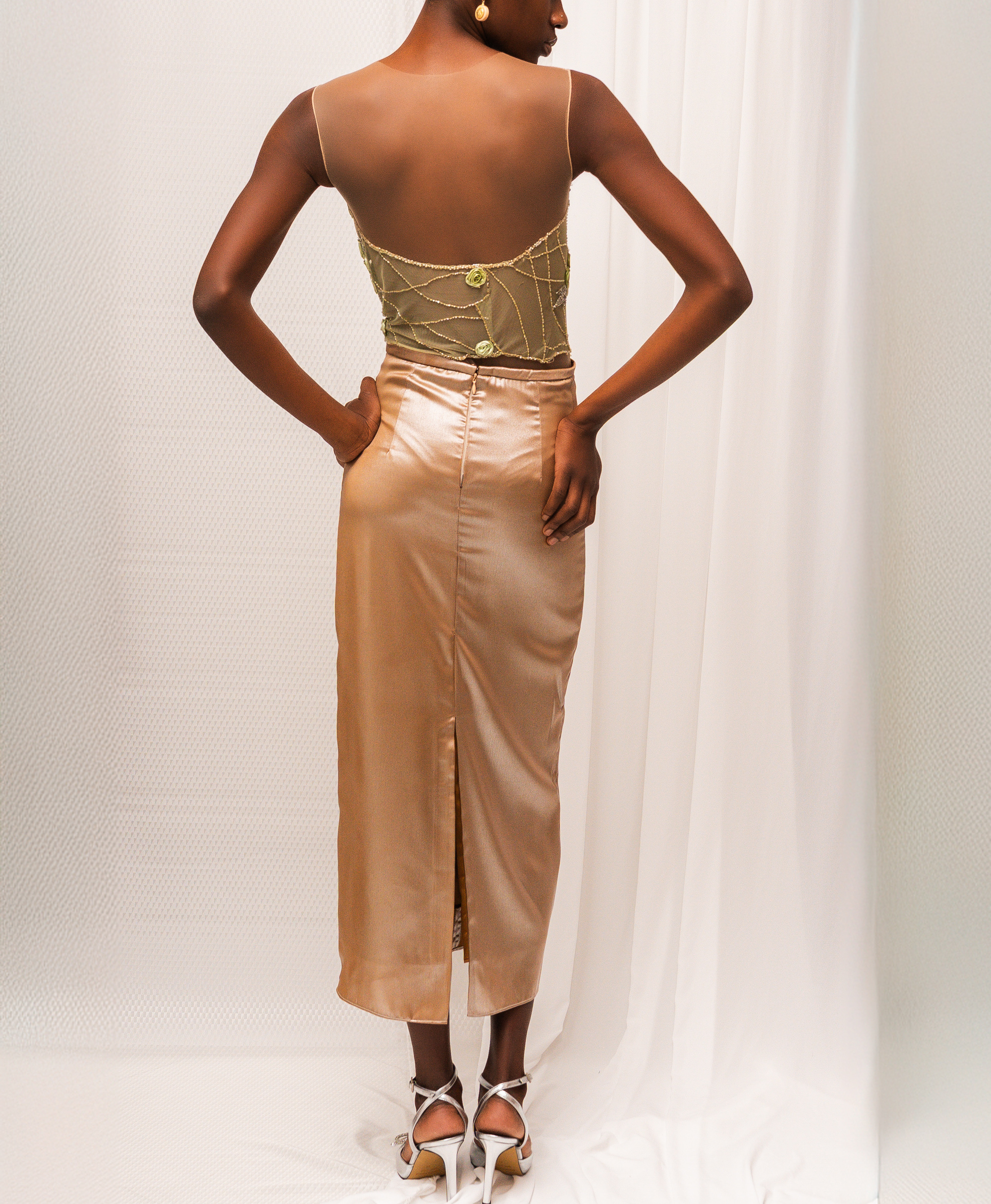 Pencil skirt with a luminous satin finish, elegant and feminine. The fitted silhouette follows the body and falls smoothly, while the full lining ensures comfort and a flawless drape. Perfect for evening wear and special occasions.