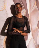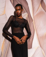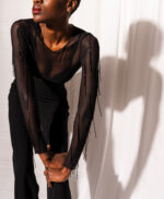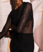 Fitted bodysuit in delicate lace with long sleeves, rounded neckline, and refined crew neck embellished with hand-sewn beads. Comfortable and versatile, it pairs beautifully with skirts or trousers, or worn under blazers for a chic and refined look. Adjustable closure with metal hooks.