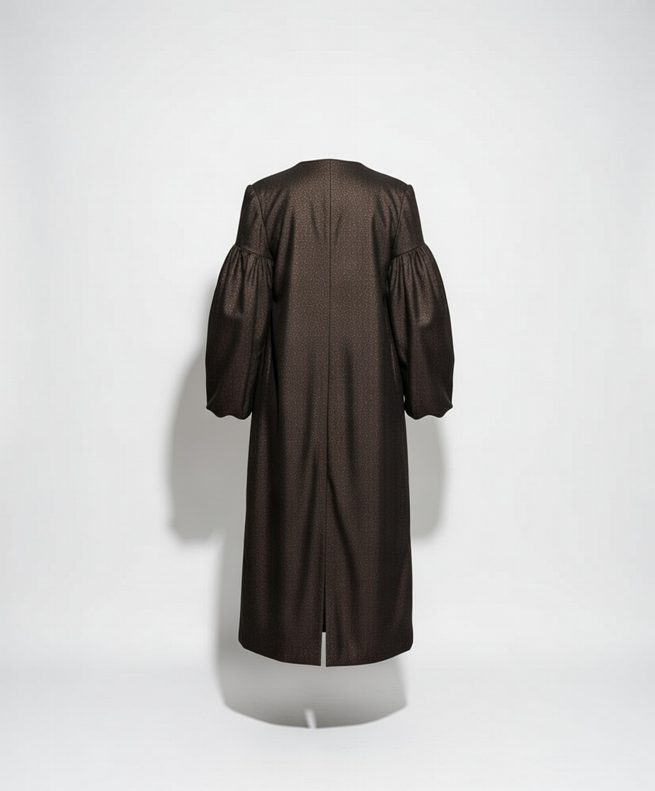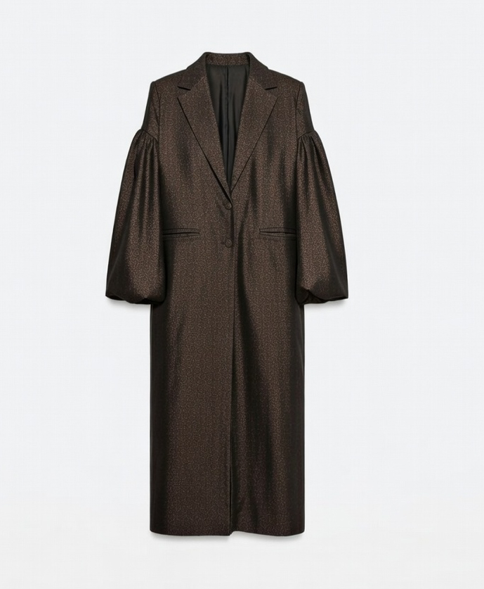 Cappotto lungo in lana con filo dorato, foderato in viscosa. Maniche a sbuffo, bottoni effetto pietra e linea sartoriale dritta.