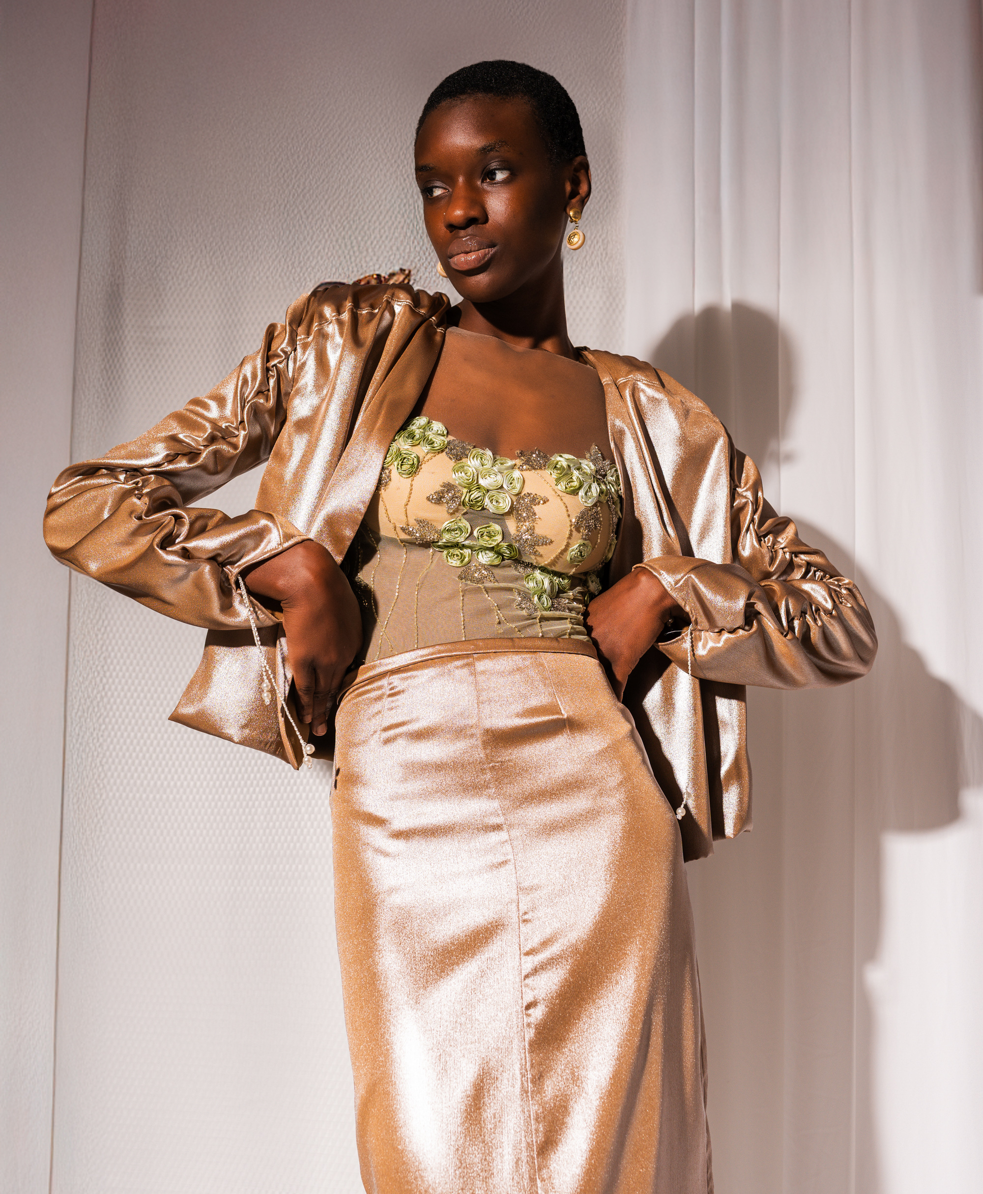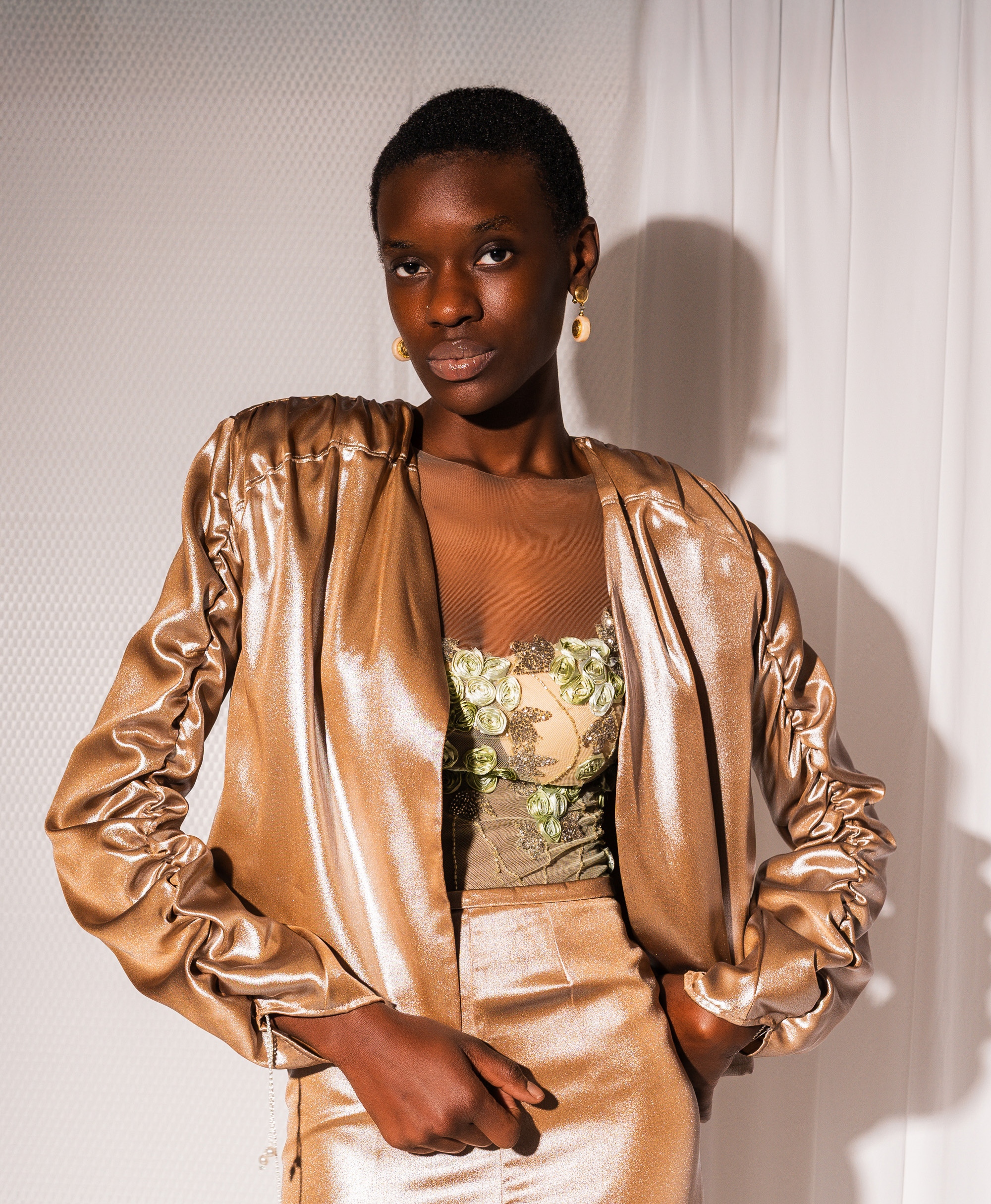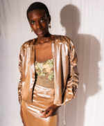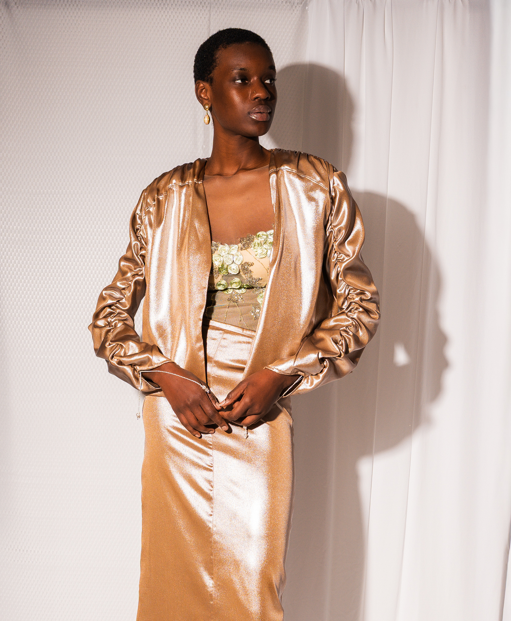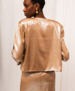 Giacca corta in poliestere dal finish luminoso. Linee pulite e design aperto sul davanti, con maniche leggermente arricciate. un capo versatile perfetto per elevare look da giorno e da sera.