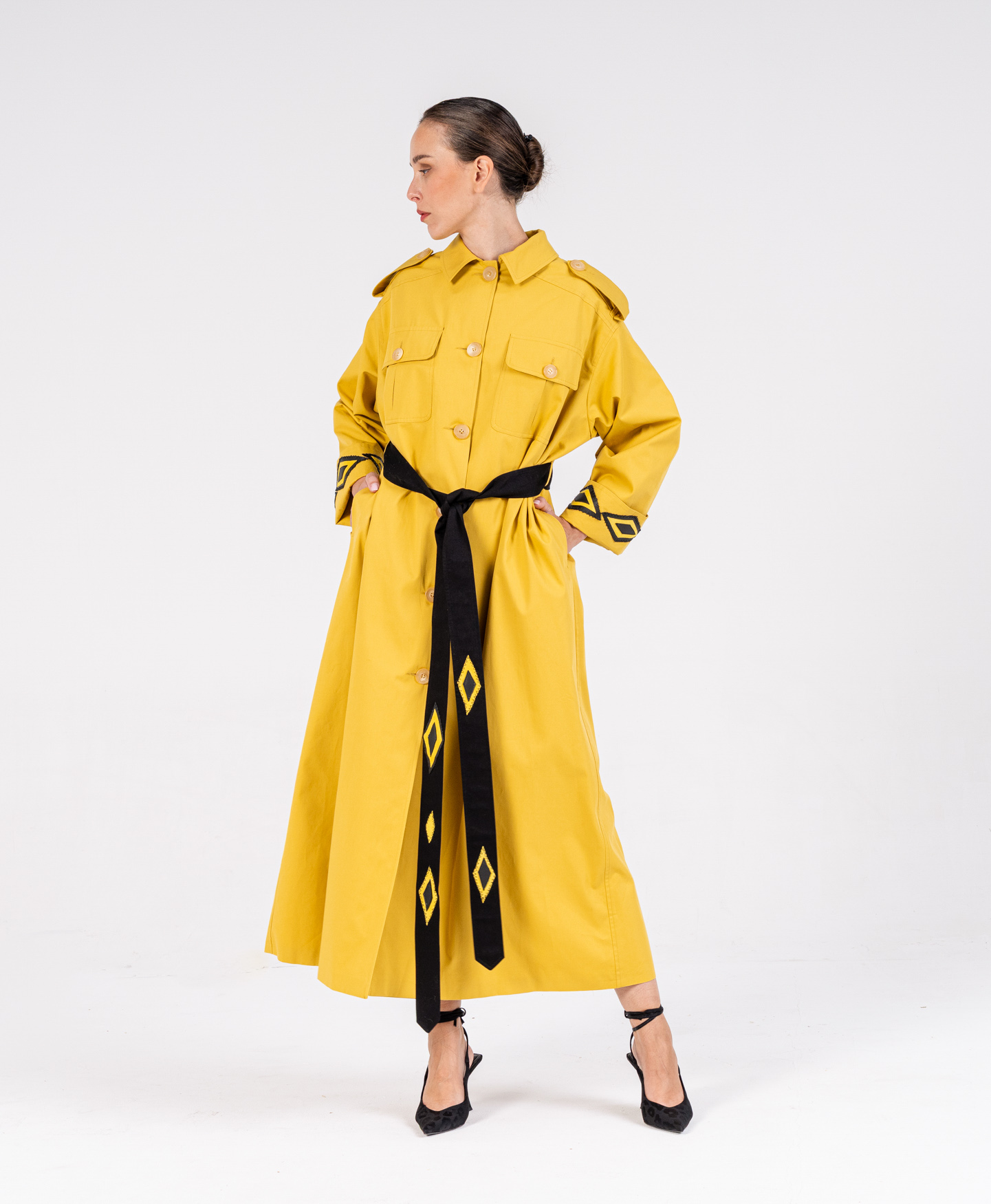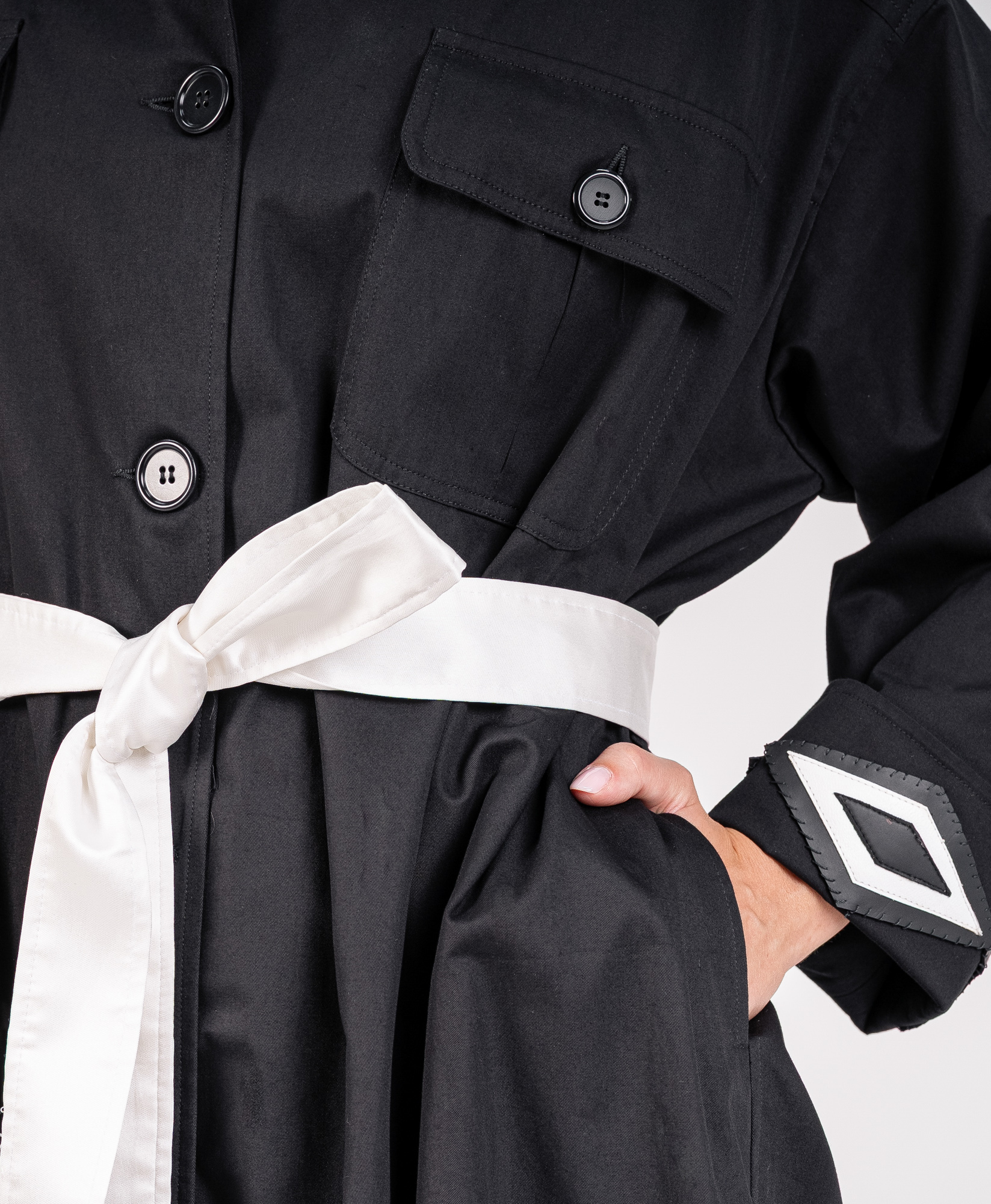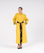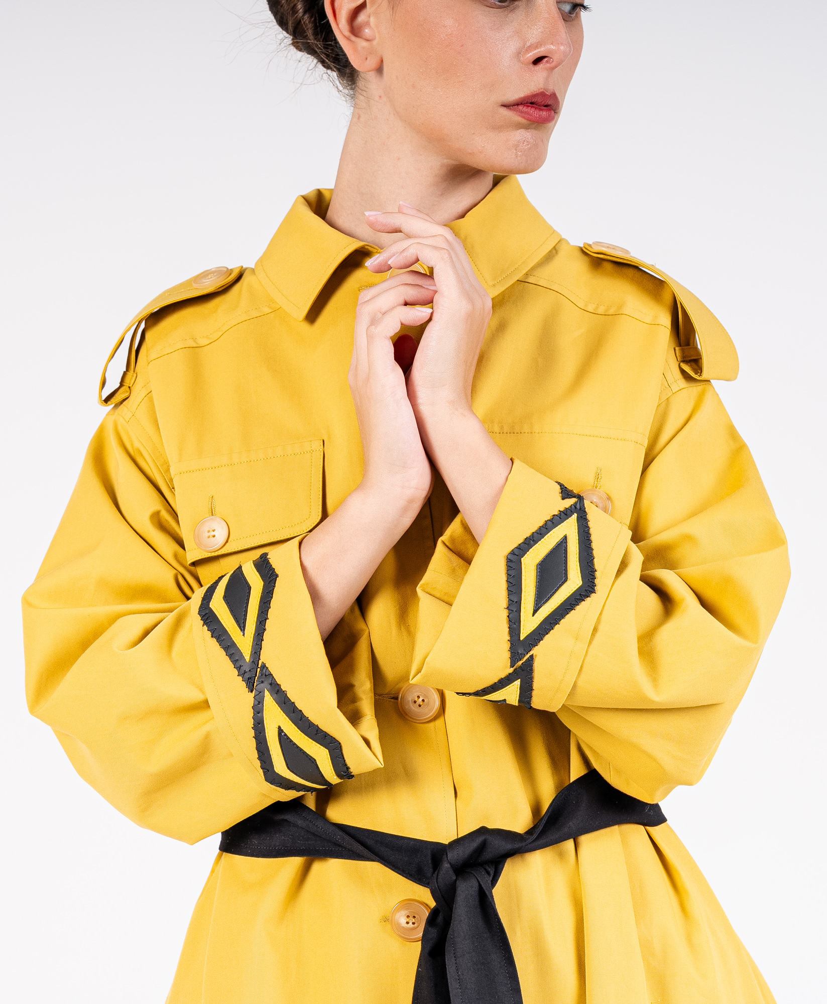 Trench realizzato in tesssuto di cotone non stretch di peso medio, leggero e traspirante, completamente foderato, completato con una cinture con dettagli in pelle ed ecopelle cuciti a mano artigianalmente, e collo dal taglio classico.