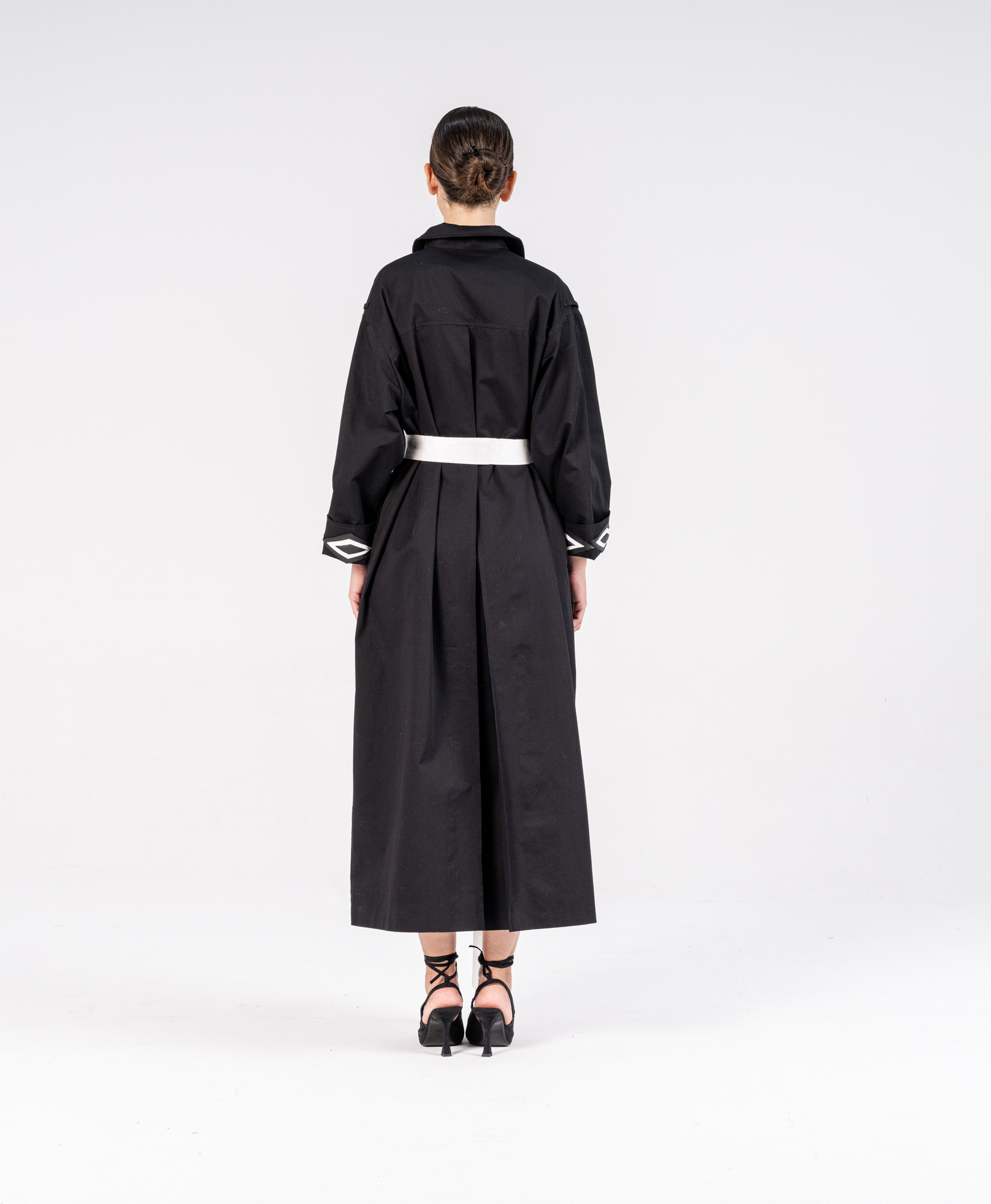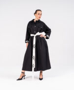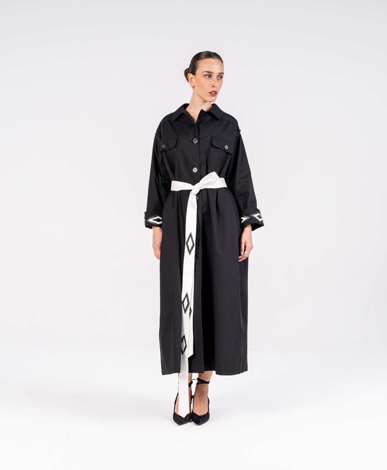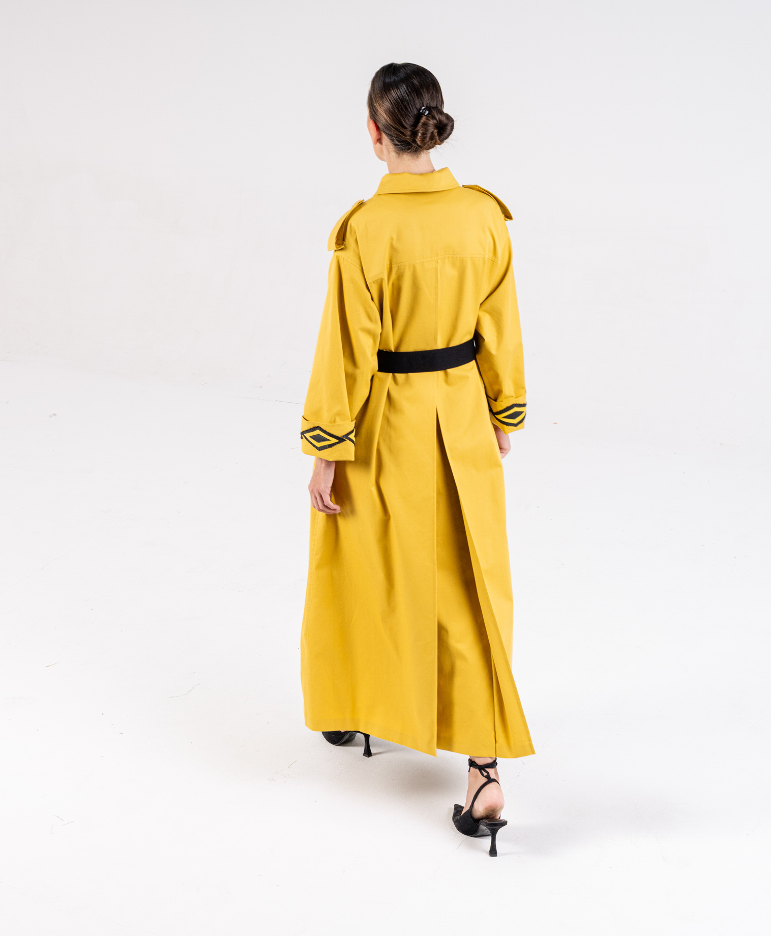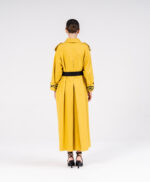 Trench realizzato in tesssuto di cotone non stretch di peso medio, leggero e traspirante, completamente foderato, completato con una cinture con dettagli in pelle ed ecopelle cuciti a mano artigianalmente, e collo dal taglio classico.