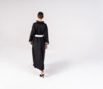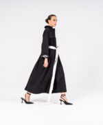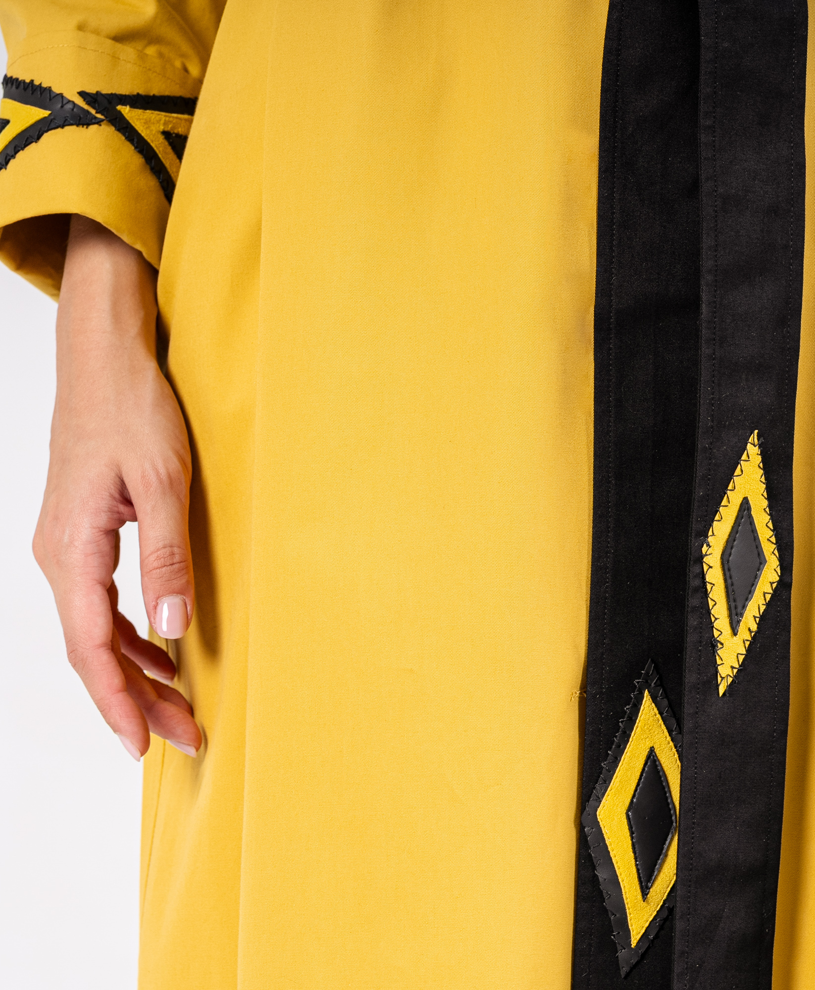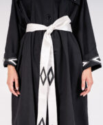 - Dettagli in pelle ed ecopelle cuciti a mano artigianalmente su maniche e cintura